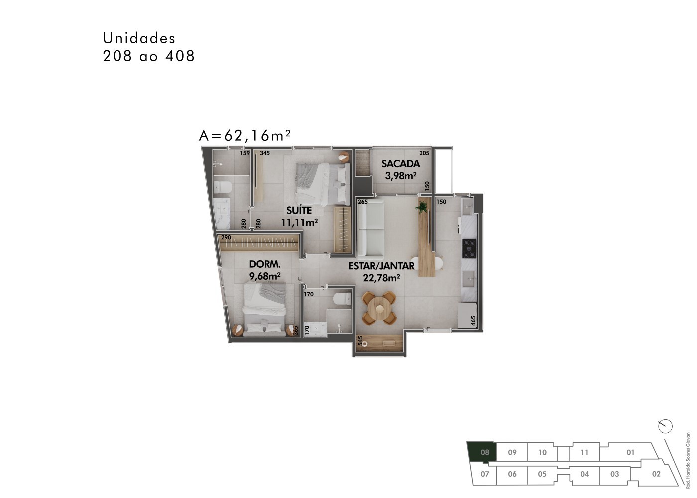Apartamento 2 quartos em Cacupé, Florianópolis com 62,16m² e suíte master. O imóvel possui 2 dormitórios sendo 1 suíte, 2 banheiros completos e 1 vaga de garagem coberta. Localizado no Condomínio Adore Cacupé, oferece acabamentos modernos e layout funcional para máximo aproveitamento dos espaços.