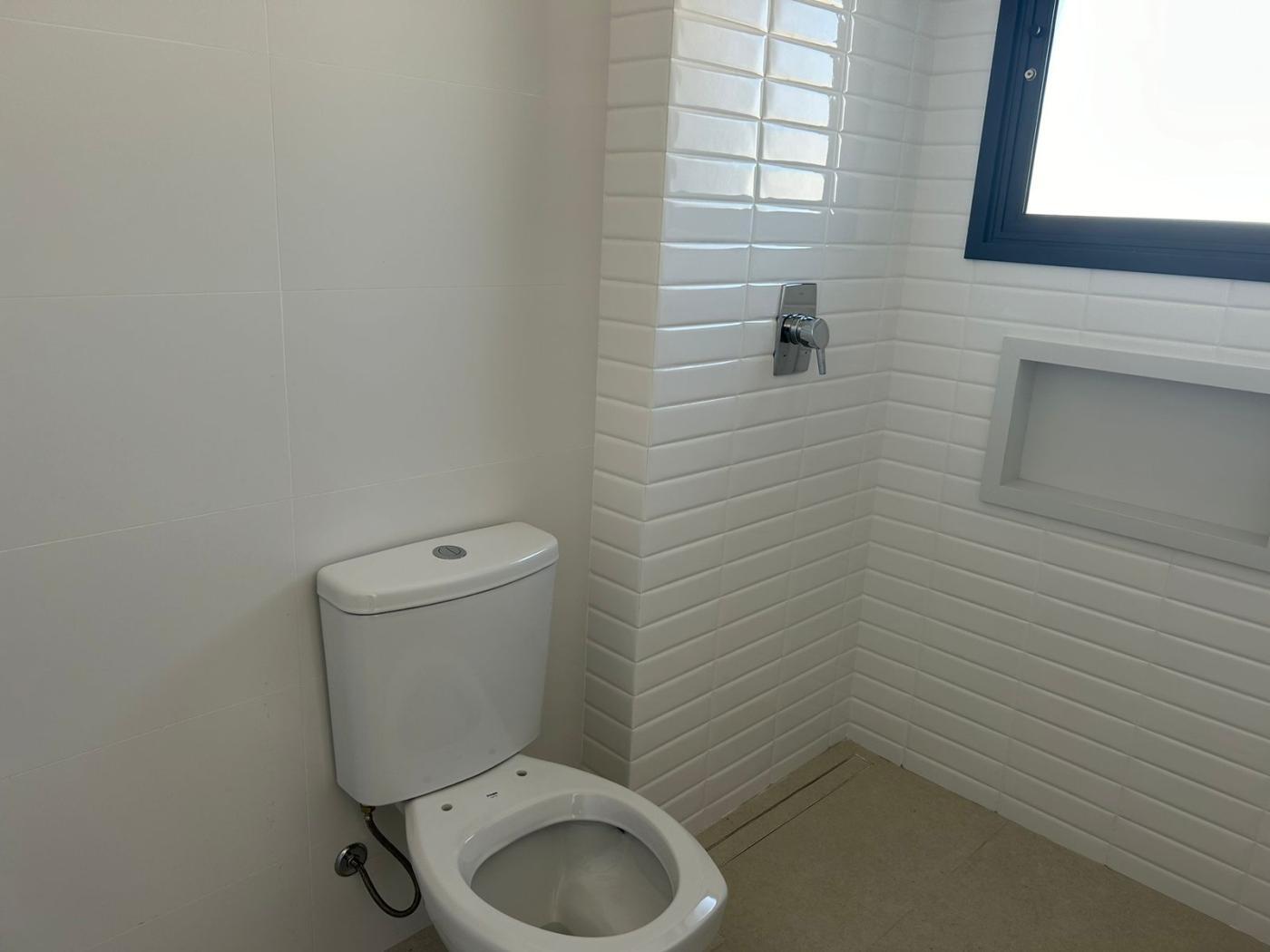 Banheiros acabados com azulejo e nicho e pastilhas no box.
