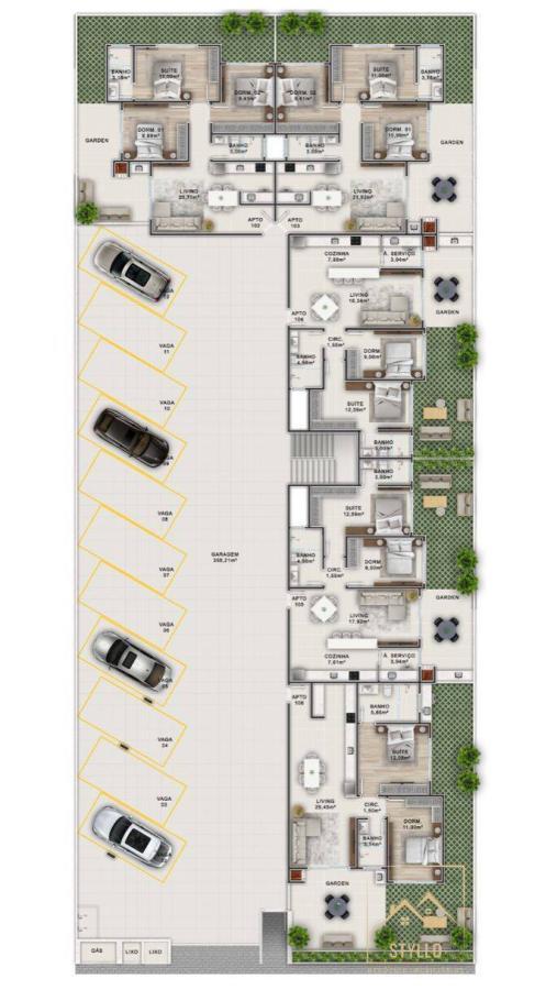 Cômodos: Sacada com churrasqueira, Área de Serviço, Dormitórios, Sala/Cozinha conceito aberto, Suíte.