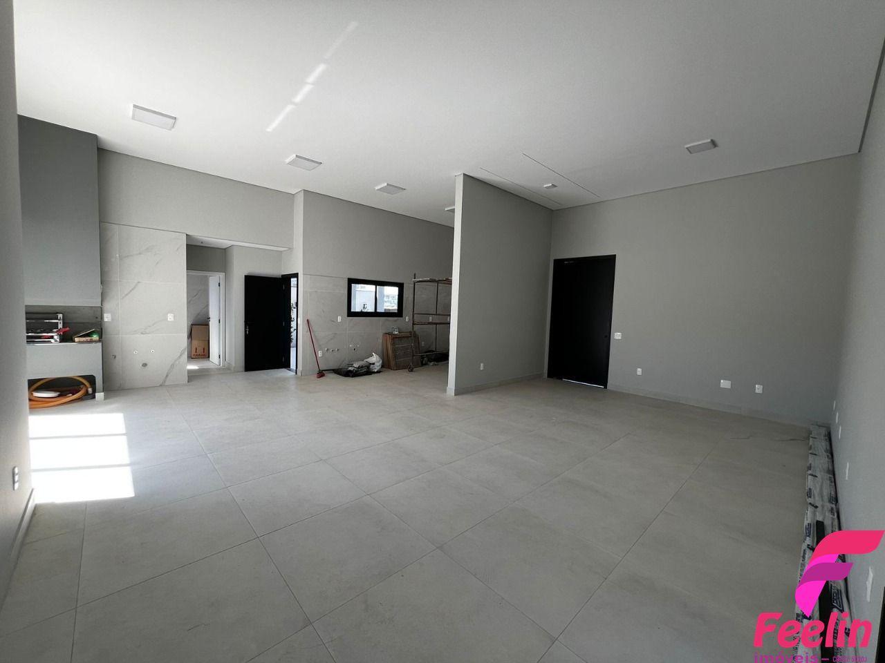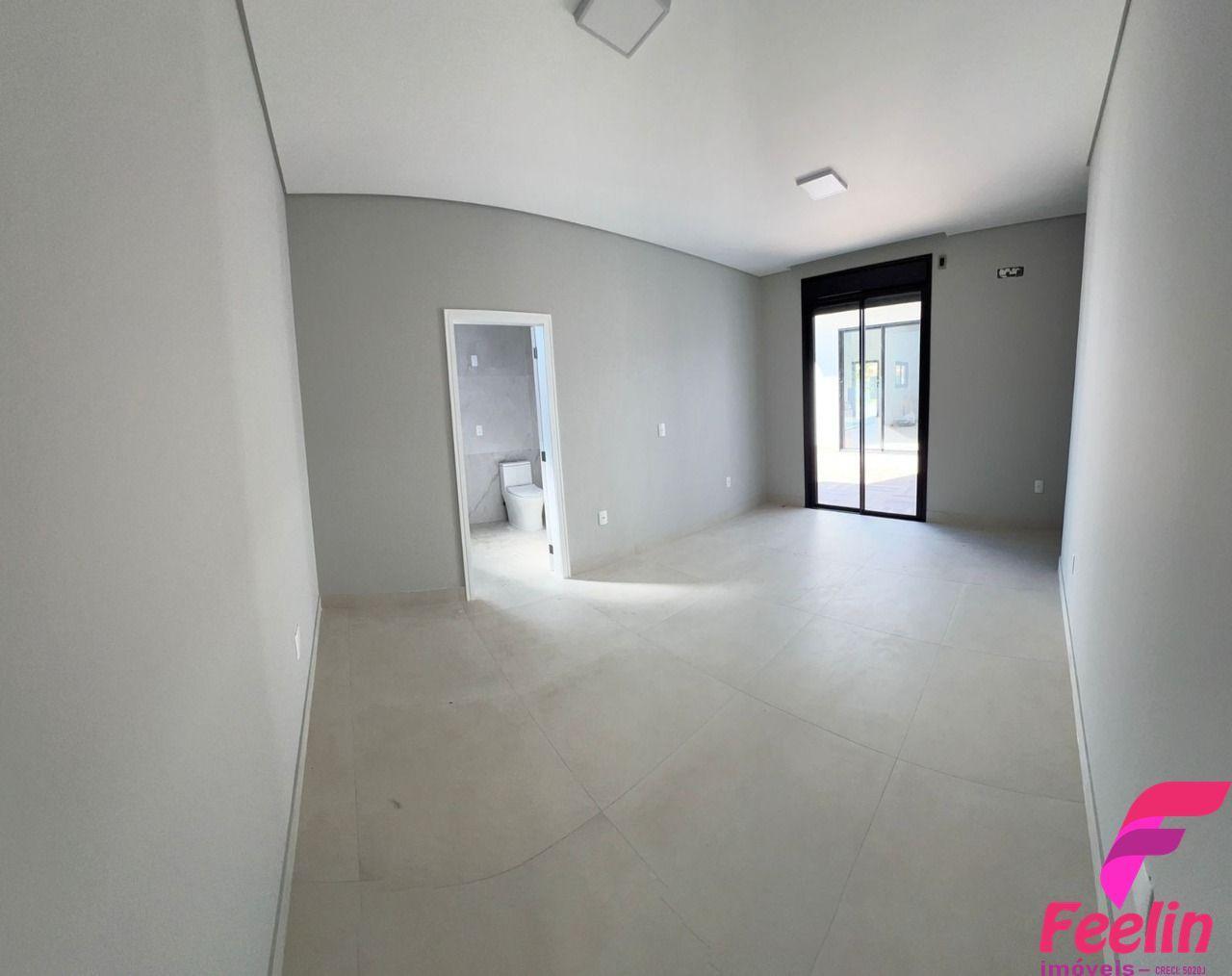 Área social (sala/cozinha/área de churrasco) com pé direito de 4,0m, demais áreas com 2,90m; parte interna da casa rebaixada em gesso acartonado, janelas em alumínio preto com vidro incolor, quartos com aberturas em persiana integrada automatizada.