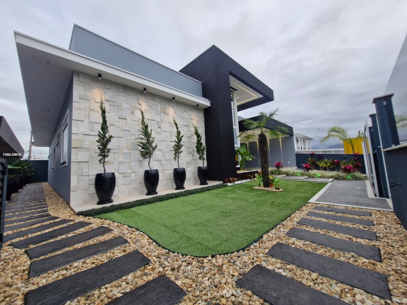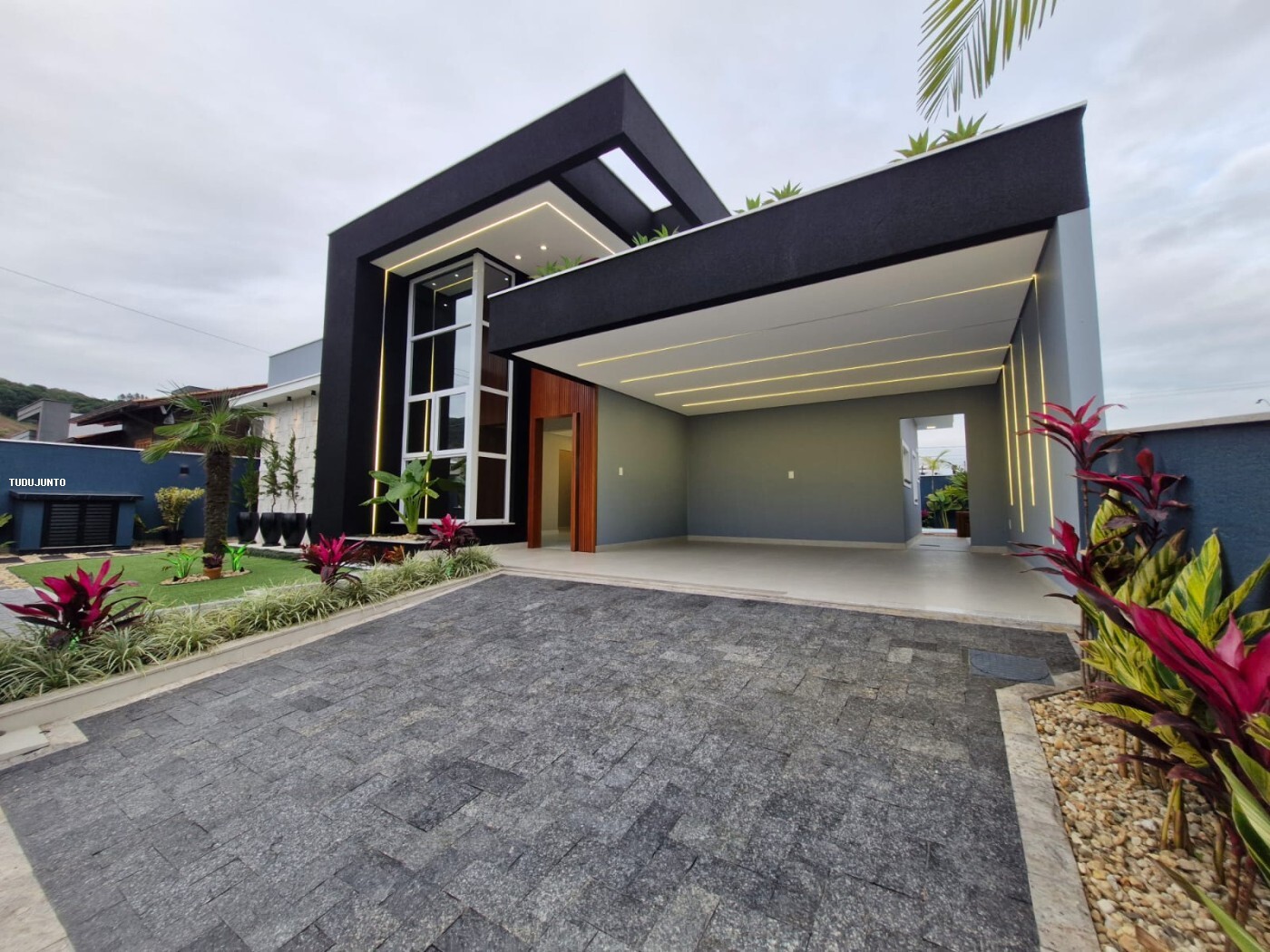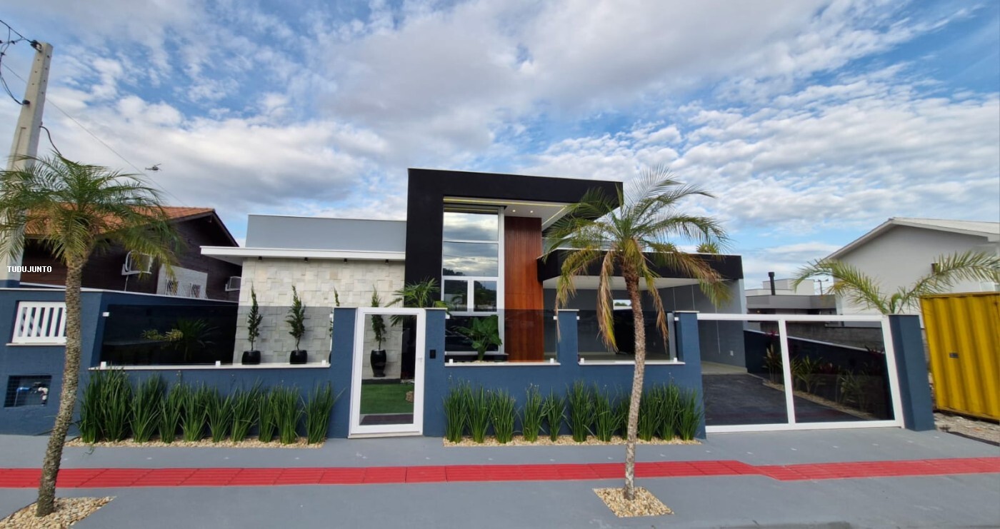 Características: Calhas pluviais, Espaço gourmet com churrasqueira, Espera para ar-condicionado, Fechadura eletrônica, Iluminação em led, Murado, Nicho nos banheiros, Rebaixo em gesso, Sala e cozinha com pé direito duplo, Lavanderia, Portão Eletrônico.
